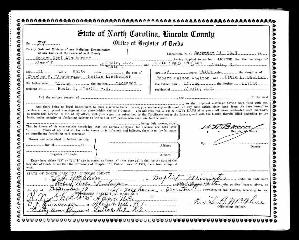 Both families worried that the young couple was rushing things, but they were determined. They married less than two weeks later, at Reverend L.A. McClure’s house near Mt. Zion church, on December 18, 1948. Without thinking about it, they married on Charlie Lineberger’s birthday (although Preacher McClure listed the date as December 19 on the certificate). Mom said they would have changed the date if they had realized it. Bobby’s father was never Mom’s favorite person.