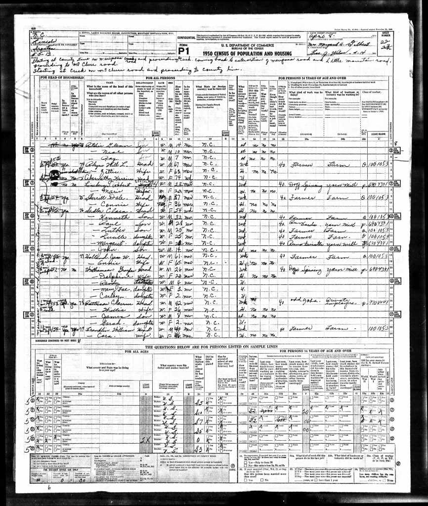Granny was getting older, and while she could mostly take care of herself, her family didn’t want her living alone. Marie and Bobby stayed with her for several years until they rented the little house in Alexis at the end of Mabry (now Mayberry) Road. I found them listed in the 1950 census, although someone had “corrected” the original entry, assuming that the young couple had to be related to the head of household. Marie is listed as Granny’s daughter, Bobby her son-in-law.
