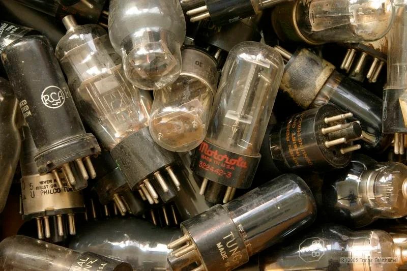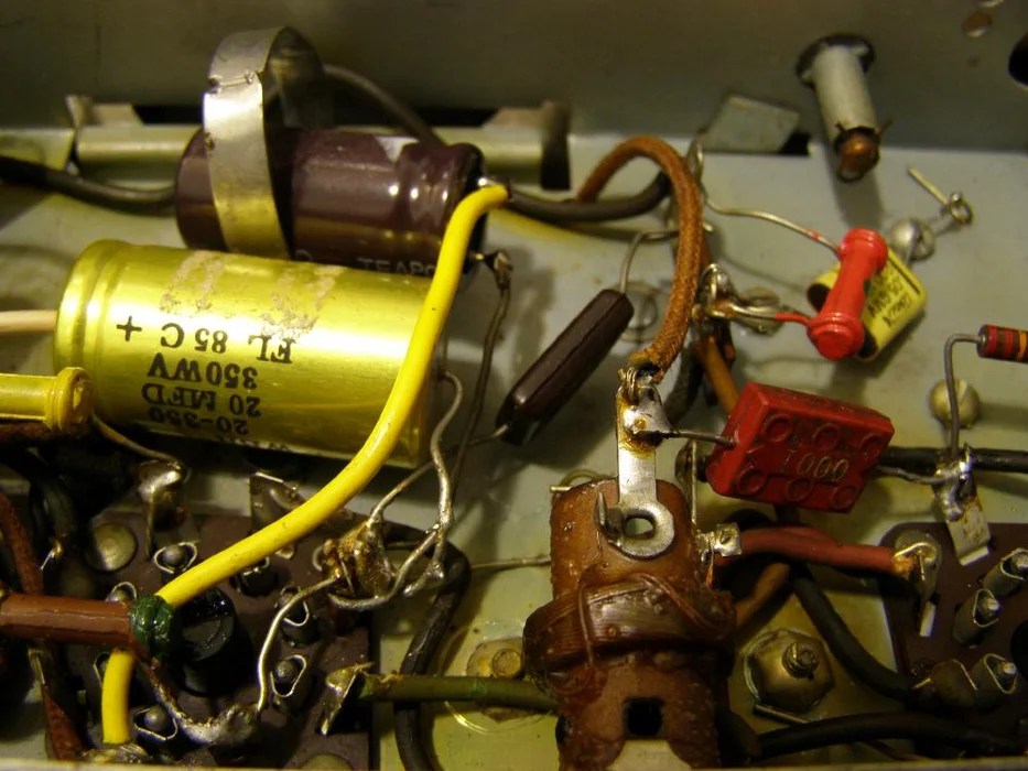 One of the benefits of Dad’s sideline business in TV and radio repair was that it gave me access to lots of spare parts. Dad worked on old tube models rather than transistor-and-printed circuit models, so when someone offered him an unwanted TV or radio, he gratefully accepted and added it to the collection. Often he could repair the item, which he would give to anyone who needed it (he never sold a salvaged model as far as I can remember). If it was beyond repair, he would take it apart and add the tubes, capacitors, and potentiometers to his boxes of parts. After he had removed all the reusable pieces, he would strip the metal chassis of any old wires and add it to the pile of chassis.